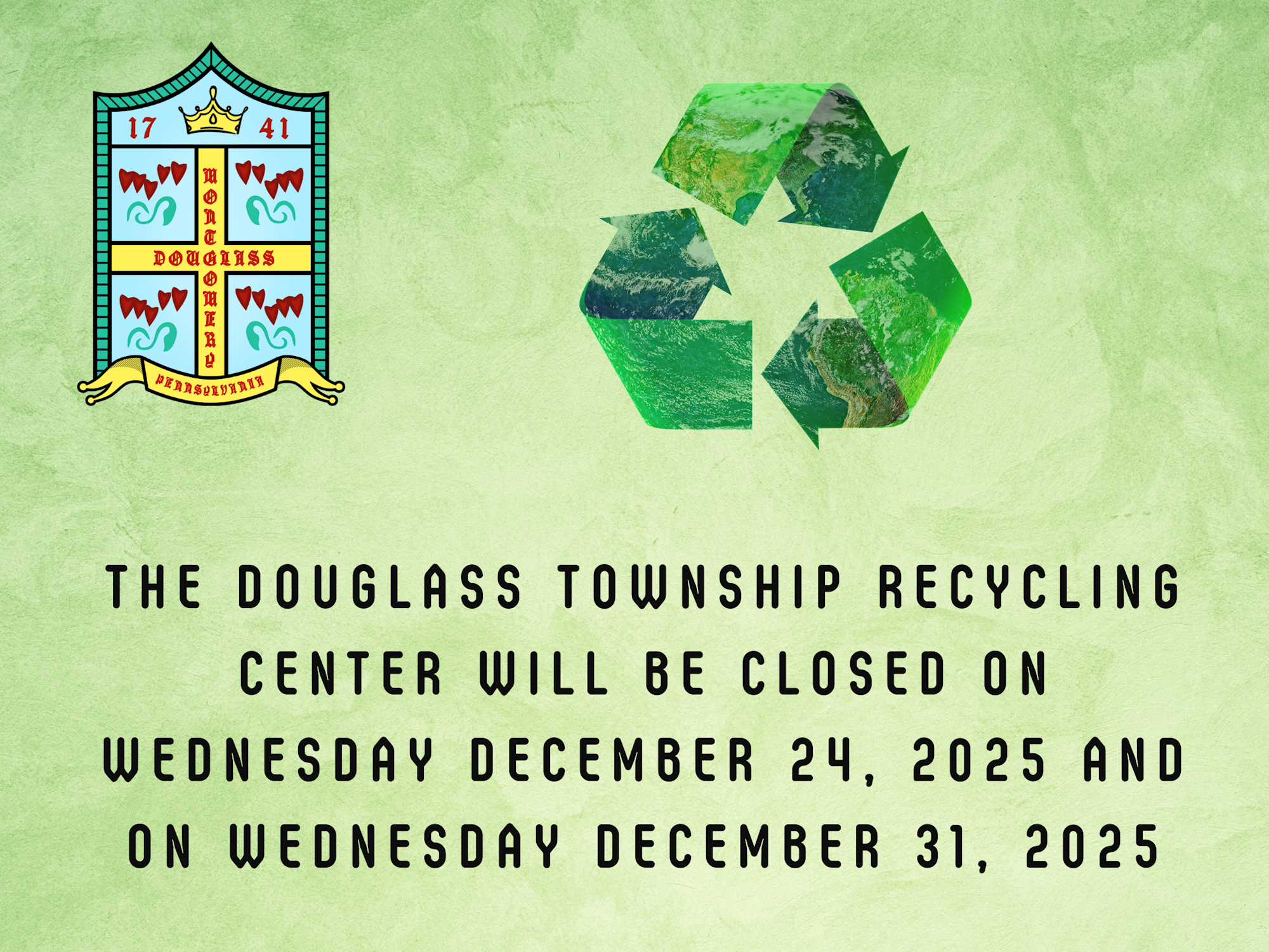 The Douglass Township Recycling Center will be closed on Wednesday December 24, 2025 for Christmas Eve and also Wednesday December 31,2025 for New Years Eve. The Recycling Center will have regular operating hours on Saturday December 26, 2025.